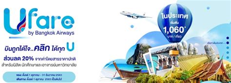 บินตรงแบบฟูลเซอร์วิสกับสายการบินบางกอกแอร์เวย์ส ทั้งในประเทศและต่างประเทศ ครอบคลุมทั้งน้ำหนักกระเป๋า 20 กก อาหารบนเที่ยวบินและการเลือกที่นั่งล่วงหน้า บัตรโดยสารโปรโมชั่น Ufare สำหรับนักศึกษา อาจารย์และบุคลากรมหาวิทยาลัย ลด 10 ในทุกระดับชั้นของบัตรโดยสารจากราคาปกติ  Fly full service with Bangkok Airways Enjoy a 20kg baggage allowance in flight meals and seat selection for domestic and  Ufare By Bangkok Airways 30 Sec 123K views 9 years ago more Bangkok Airways 26 9K Subscribe 11 Share ตั๋วโปรฯ เพื่อนักศึกษาและอาจารย์มหาวิทยาลัย เส้นทางในประเทศ เริ่มต้น 1 200 บาท เที่ยว ผ่านช่องทาง www bangkokair com ufare ฟรี น้ำหนักกระเป๋า 20 กก